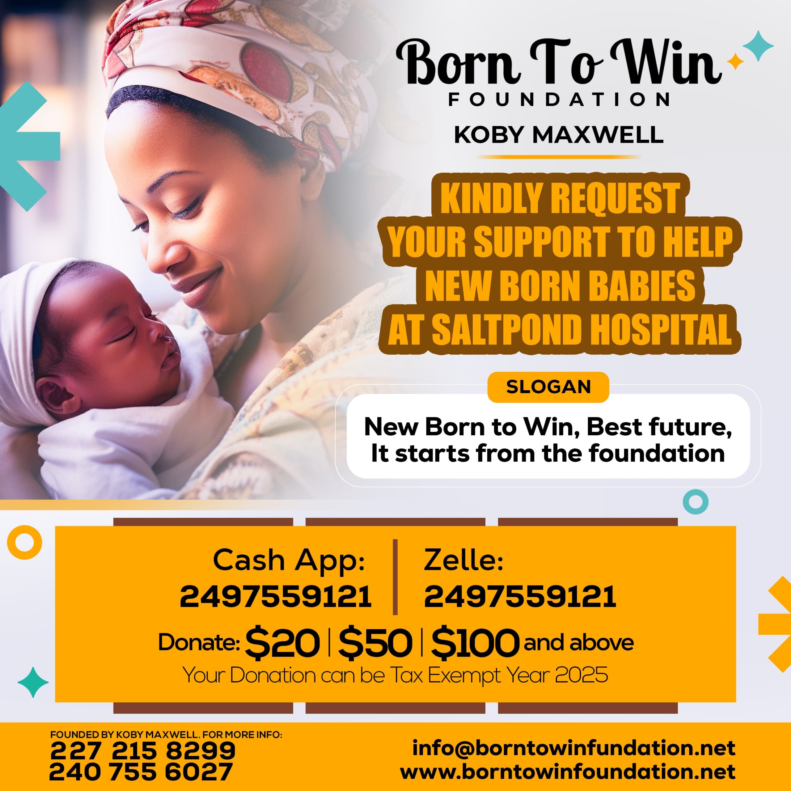 Our goal, and mission is to give back to Maternal women through birth. In other for a newBORN to have the (WIN) best future We believe it starts from the FOUNDATION.One mother at a time. One birth at a time. One Child at a time. One Win at all time.